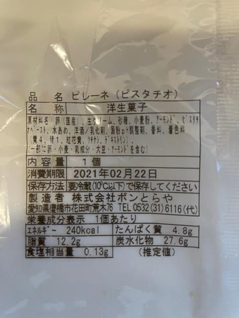 ピレーネ1個あたり240キロカロリー、タンパク質4.8g、脂質12.2g。