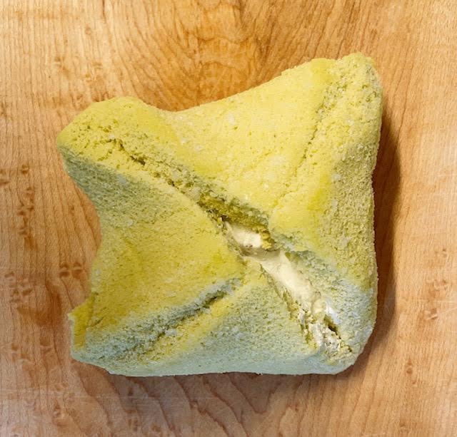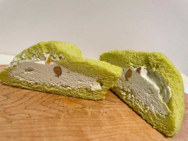 半分に切るとこんな感じ。生地はやはりピスタチオ味なので抹茶のような明るい緑色をしてます ケーキみたいで食欲そそられますね…The炭水化物最高