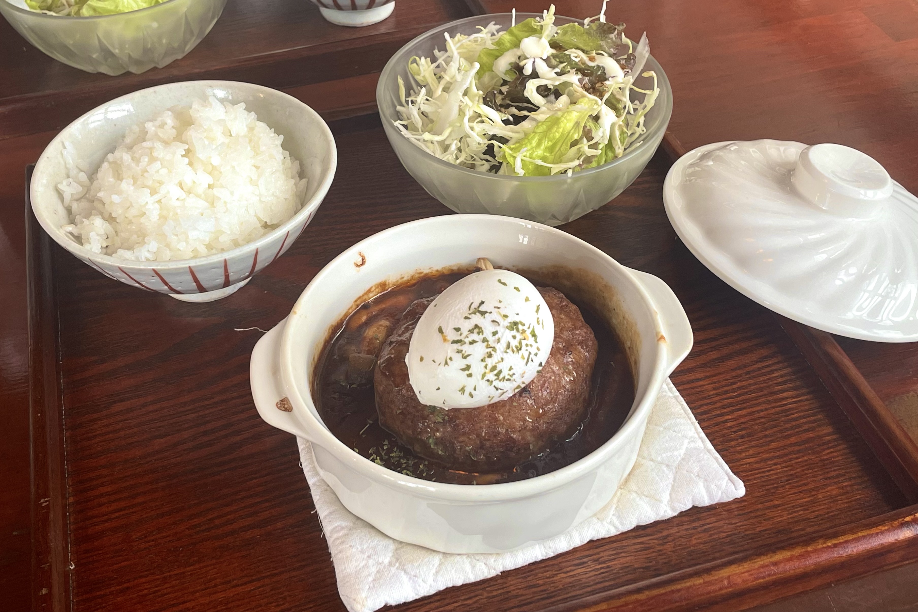 煮込みハンバーグに加えてサラダ、スープ、ドリンクまで
